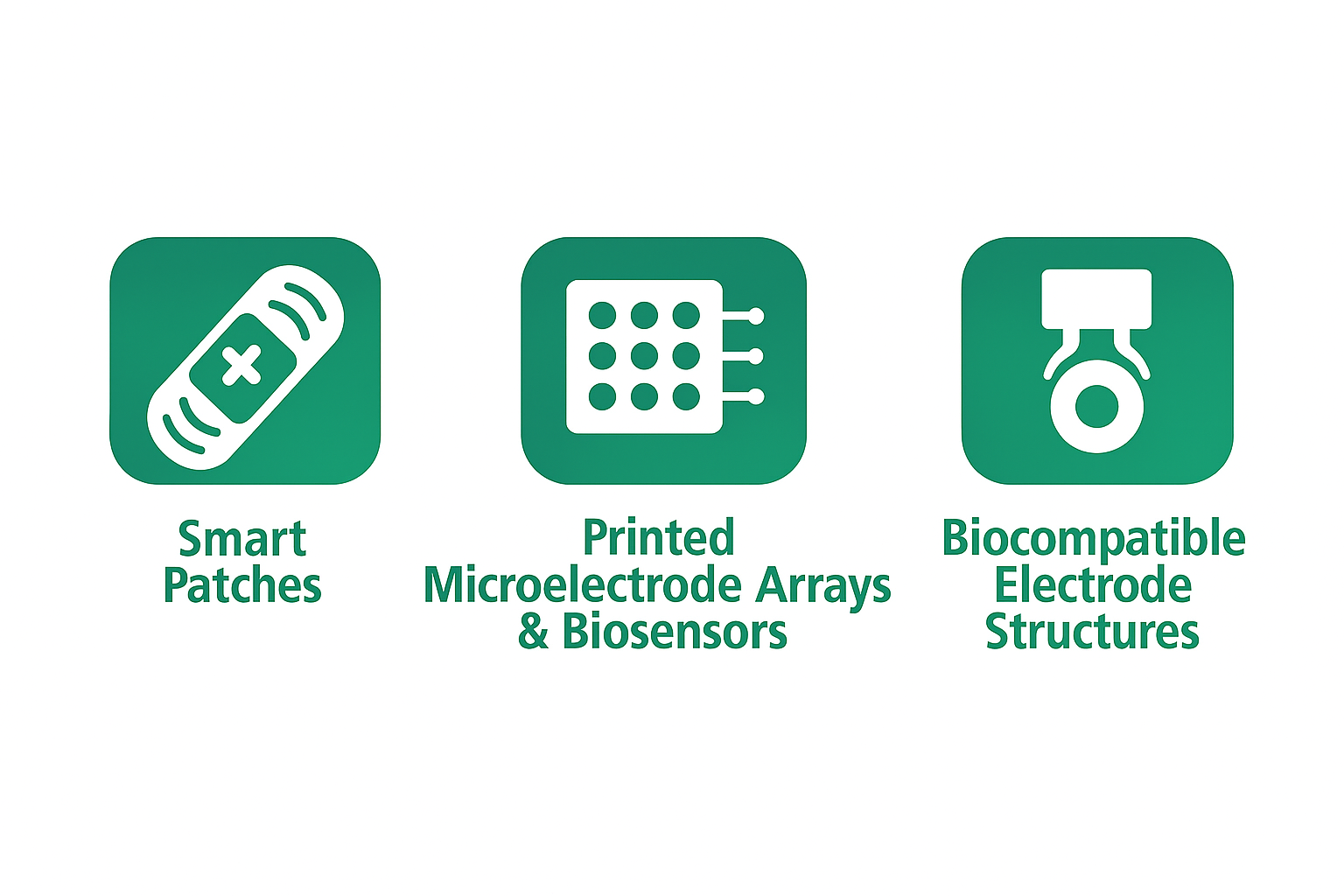 Applications such as smart patches, printed microelectrode arrays and biosensors, biocompatible electrode structures